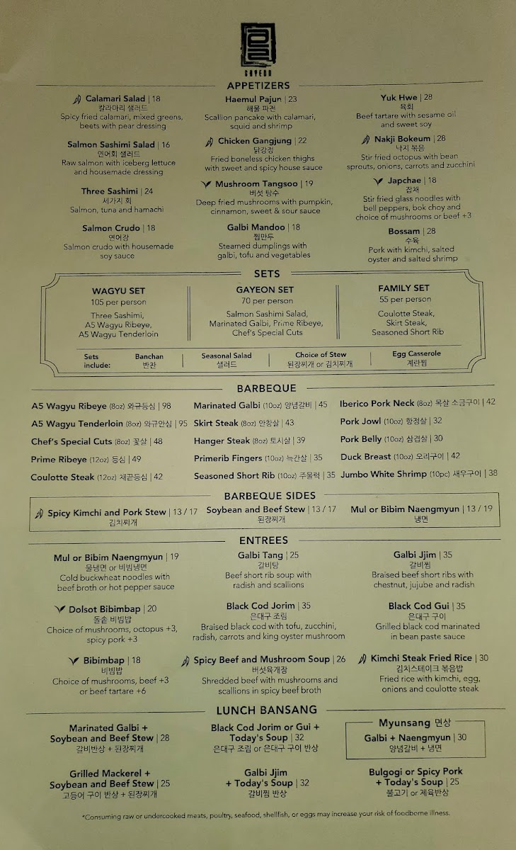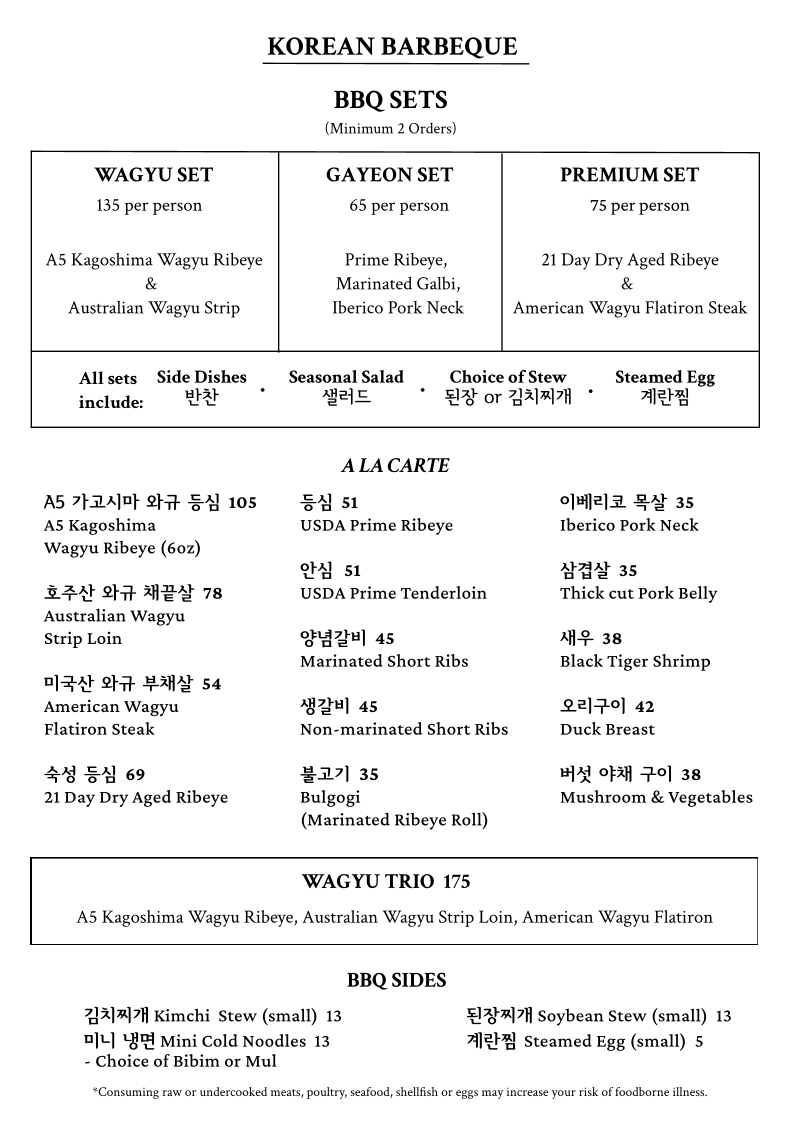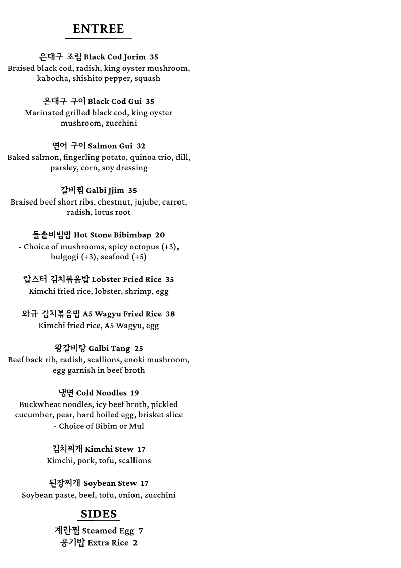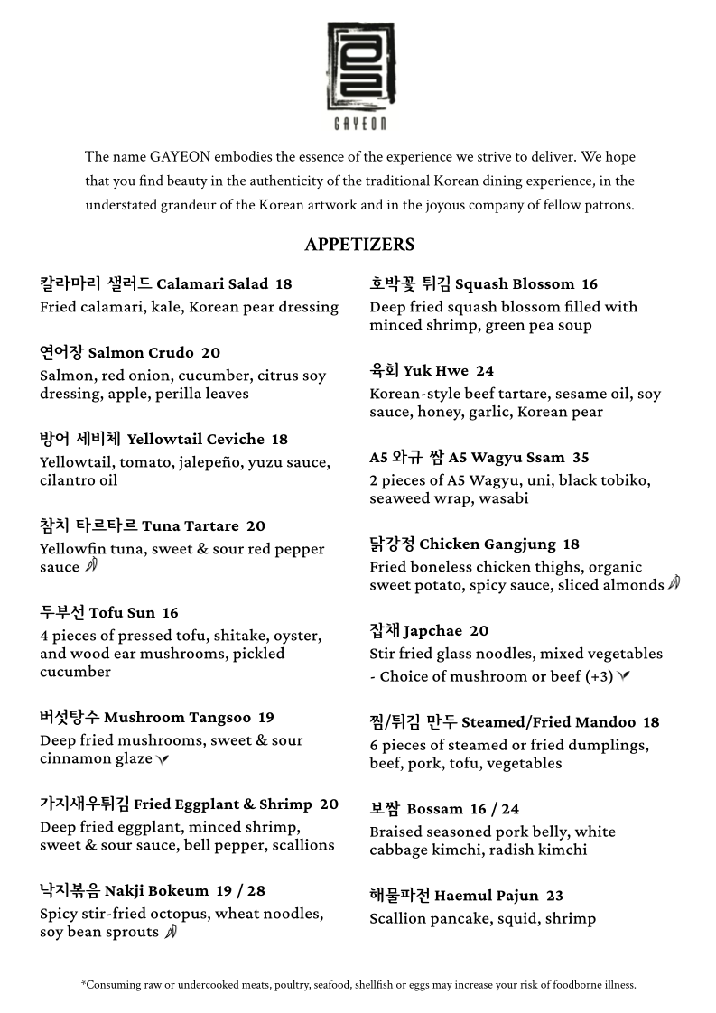 At Gayeon, every dish tells a story inspired by the rich flavors of Korean cuisine, crafted with care and creativity. The menu is a delightful mix of traditional classics and innovative twists, showcasing the best of what Korean cooking has to offer. Whether you're in the mood for a sizzling BBQ experience or a comforting bowl of bibimbap, there's something here to satisfy every craving. The dishes are made with the freshest ingredients, each bursting with bold, authentic flavors. From hearty stews to savory pancakes, the vibrant flavors are sure to take your taste buds on a journey. At Gayeon, the food isn't just a meal, it's an experience that brings the warmth of Korean culture right to your table.