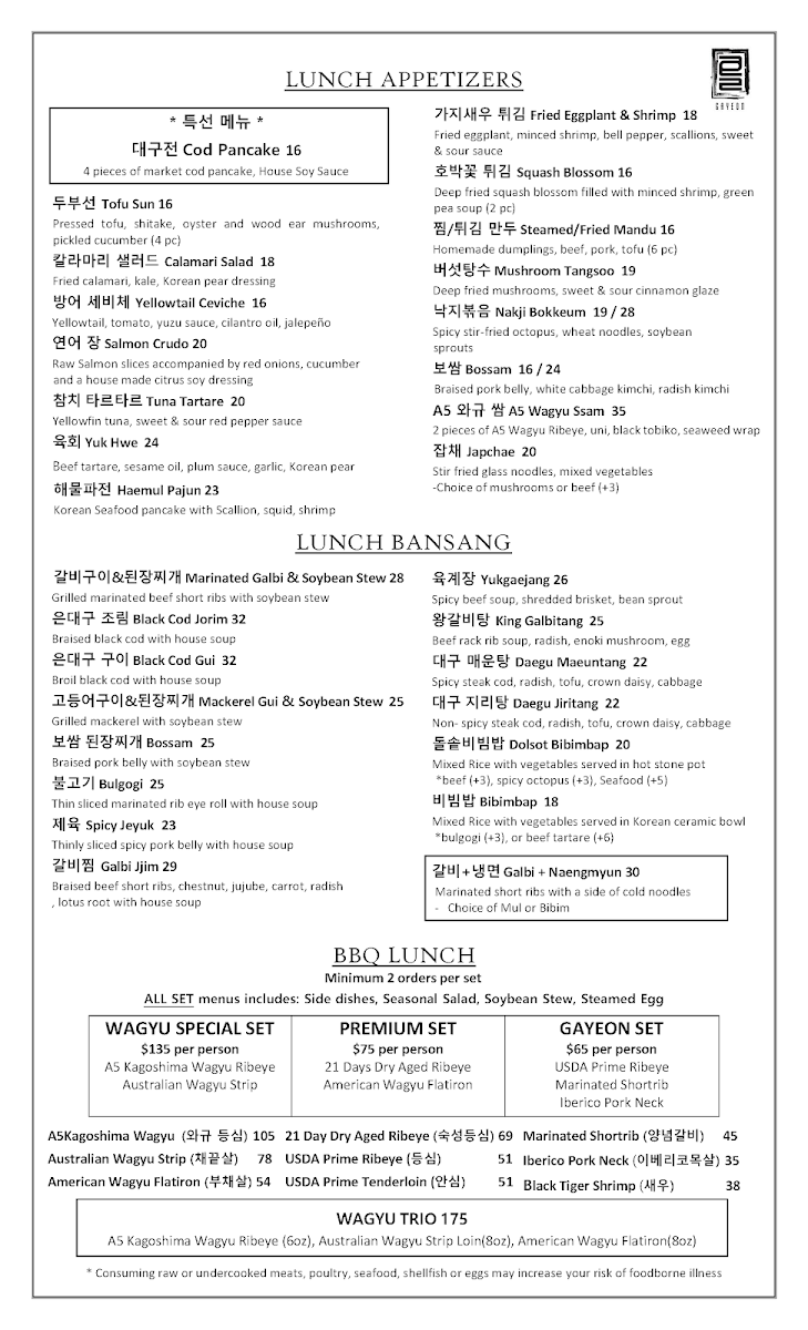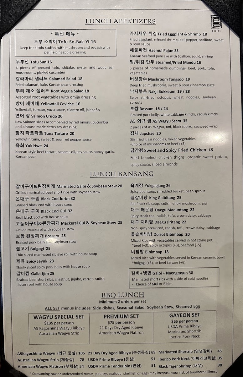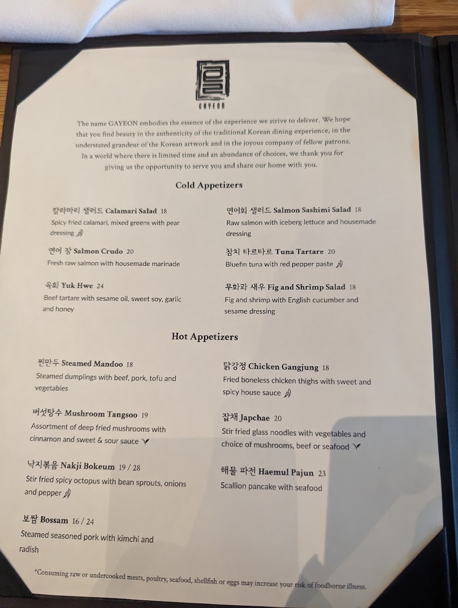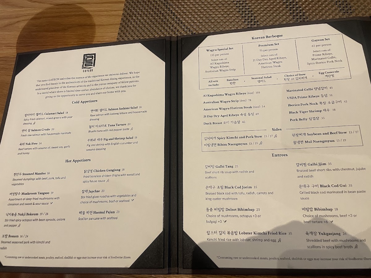 At Gayeon, every dish tells a story inspired by the rich flavors of Korean cuisine, crafted with care and creativity. The menu is a delightful mix of traditional classics and innovative twists, showcasing the best of what Korean cooking has to offer. Whether you're in the mood for a sizzling BBQ experience or a comforting bowl of bibimbap, there's something here to satisfy every craving. The dishes are made with the freshest ingredients, each bursting with bold, authentic flavors. From hearty stews to savory pancakes, the vibrant flavors are sure to take your taste buds on a journey. At Gayeon, the food isn't just a meal, it's an experience that brings the warmth of Korean culture right to your table.
